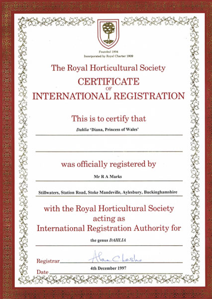 Exhibition Dahlia has been around for 25 years under the name of Chiltern Valley Flowers run by Robin Marks. With a wide range of expertise in growing dahlias from Decorative to Cactus Dahlias, Robin has won many prizes for his flowers. One of Robins best achievements in his career of Dahlias has been growing the Dahlia for Diana, Princess of Wales as you can see in the certificate on the right. Other famous people have had Dahlia's grown by Robin such as Pete Sampras, Sir Elton John and many others.